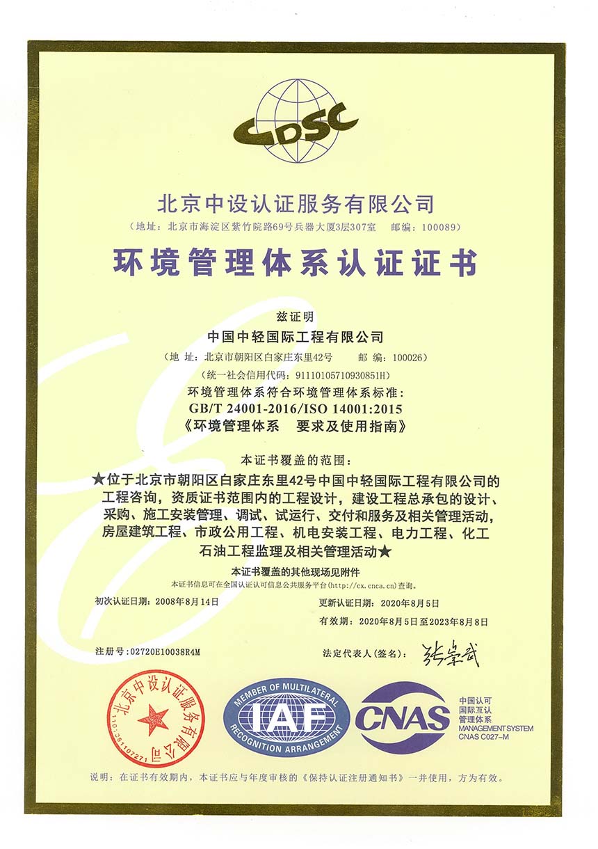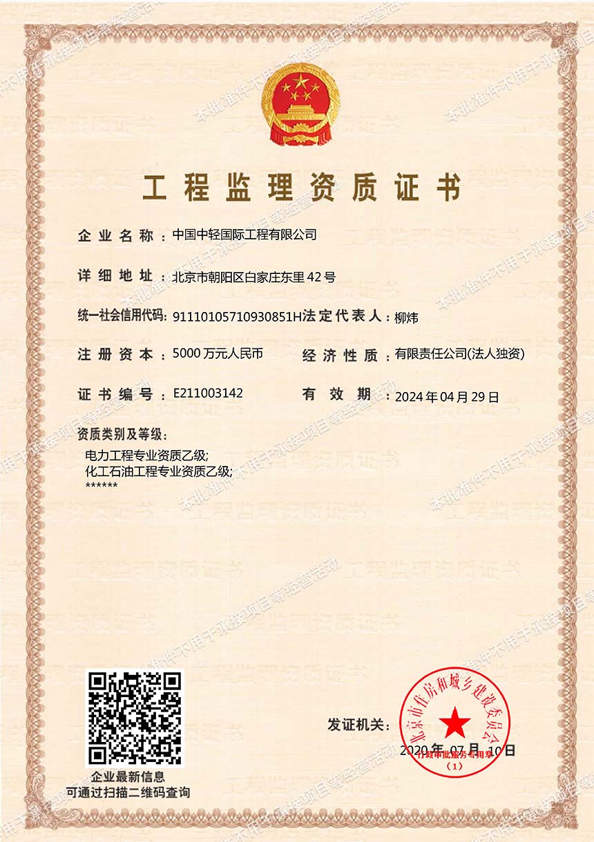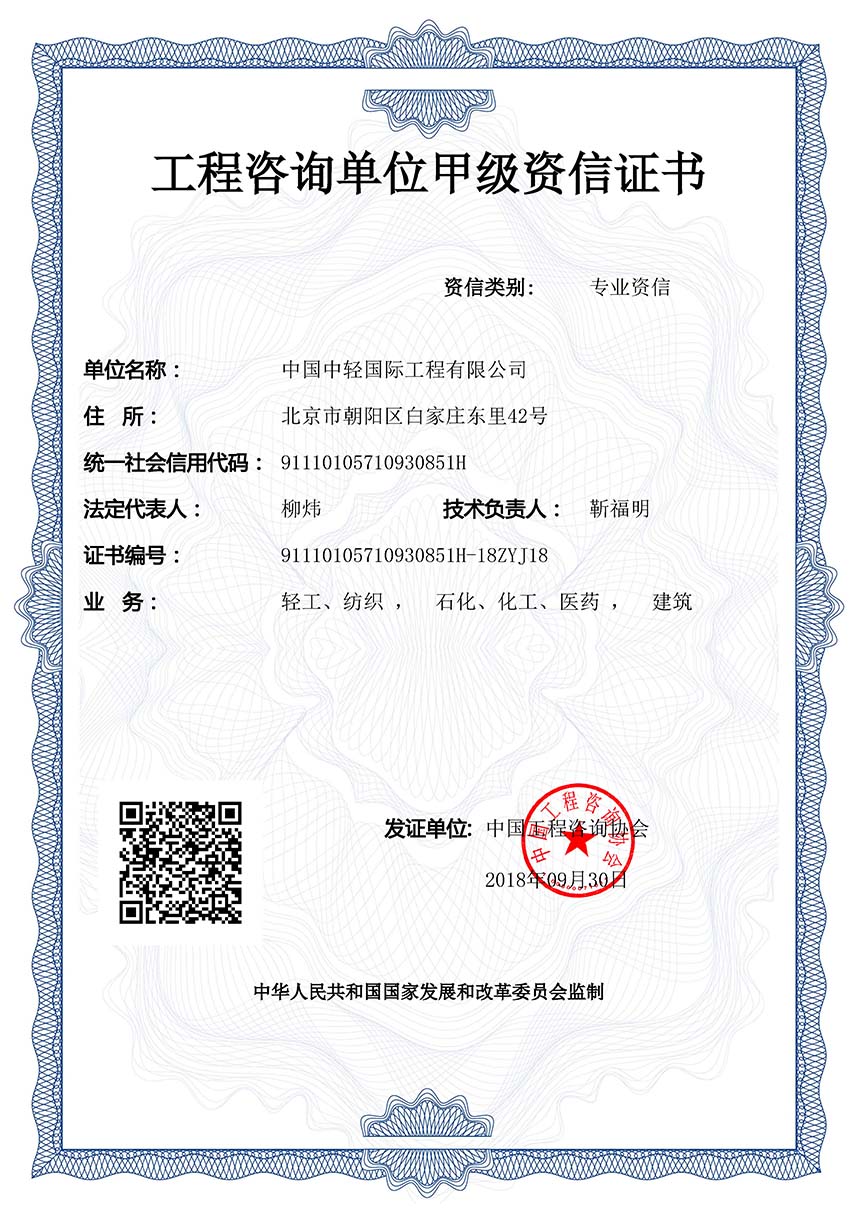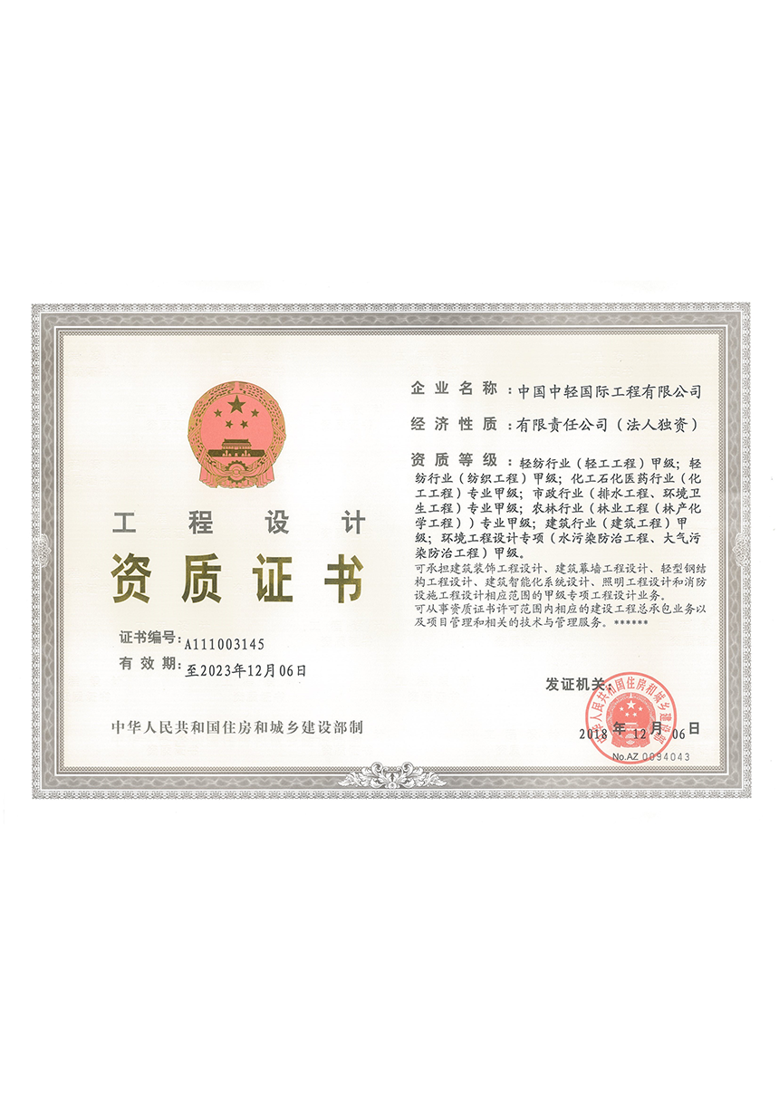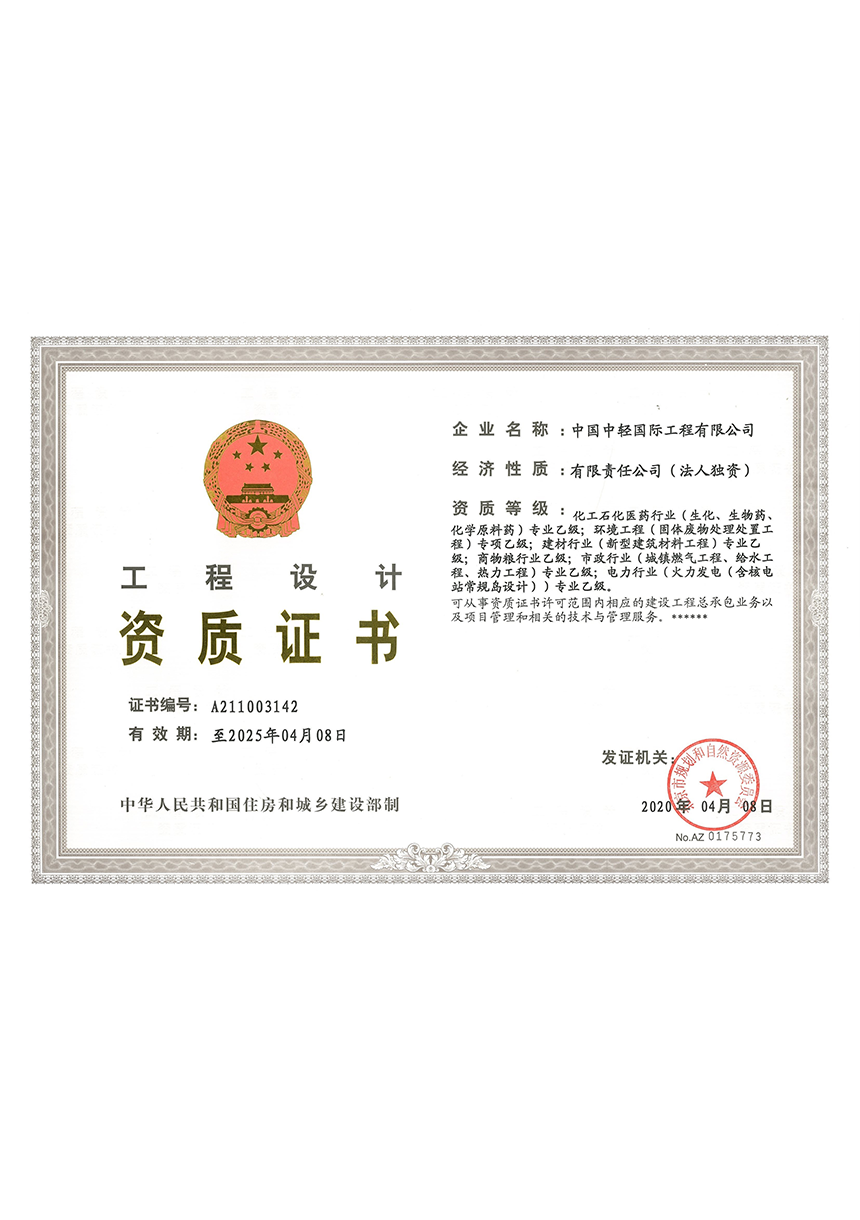 CLIEC is a large engineering company mainly engaged in consulting, design, supervision, project management, and engineering general contracting, with import and export enterprise qualification certificates; A-level design qualifications for the entire textile industry, chemical, petrochemical, and pharmaceutical industry (chemical engineering), municipal industry (drainage engineering, environmental sanitation engineering), agricultural and forestry industry (forest chemical engineering), construction industry (construction engineering), and environmental engineering special projects (water pollution prevention and control engineering, air pollution prevention and control engineering); B-level design qualifications in urban and rural planning, commercial and food industries, chemical, petrochemical and pharmaceutical industries (biochemistry, biopharmaceuticals, chemical raw materials), electric power industry (thermal power generation), construction materials industry (new construction materials engineering), municipal industry (water supply engineering, town gas engineering, thermal engineering) and environmental engineering special projects (solid waste treatment and disposal engineering); 2nd-level qualifications for professional contracting of architectural decoration and renovation engineering, general contracting of construction engineering, general contracting of petrochemical engineering construction, and professional contracting of environmental protection engineering; A-level qualification for engineering consulting credit; A-level qualification for engineering supervision; AAA credit evaluation of engineering cost; the design license of pressure vessels and pressure pipelines. Since 2009, CLIEC has been continuously recognized as a national high-tech enterprise.