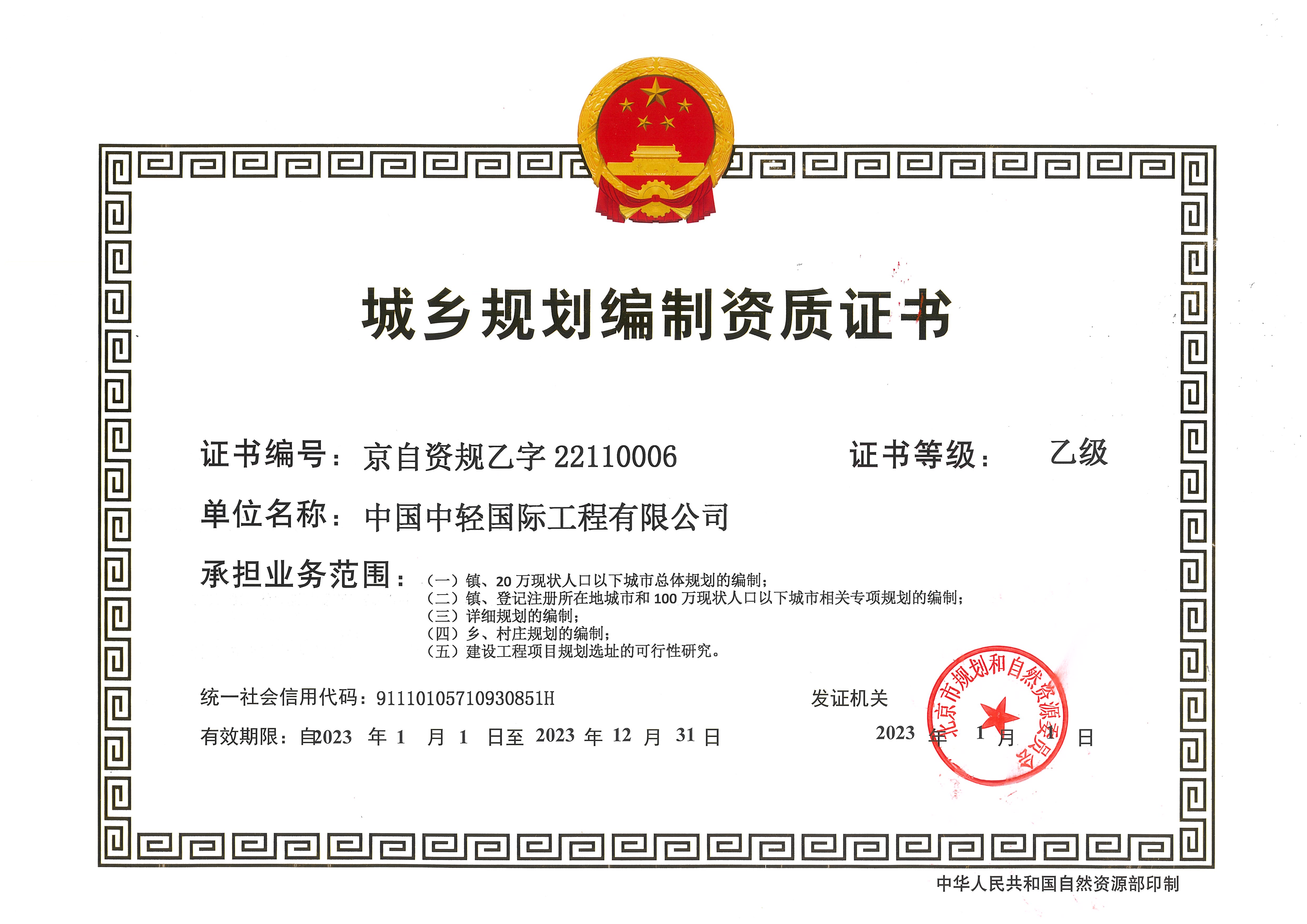 • Urban and Rural Planning Design Grade B Qualification Certificate