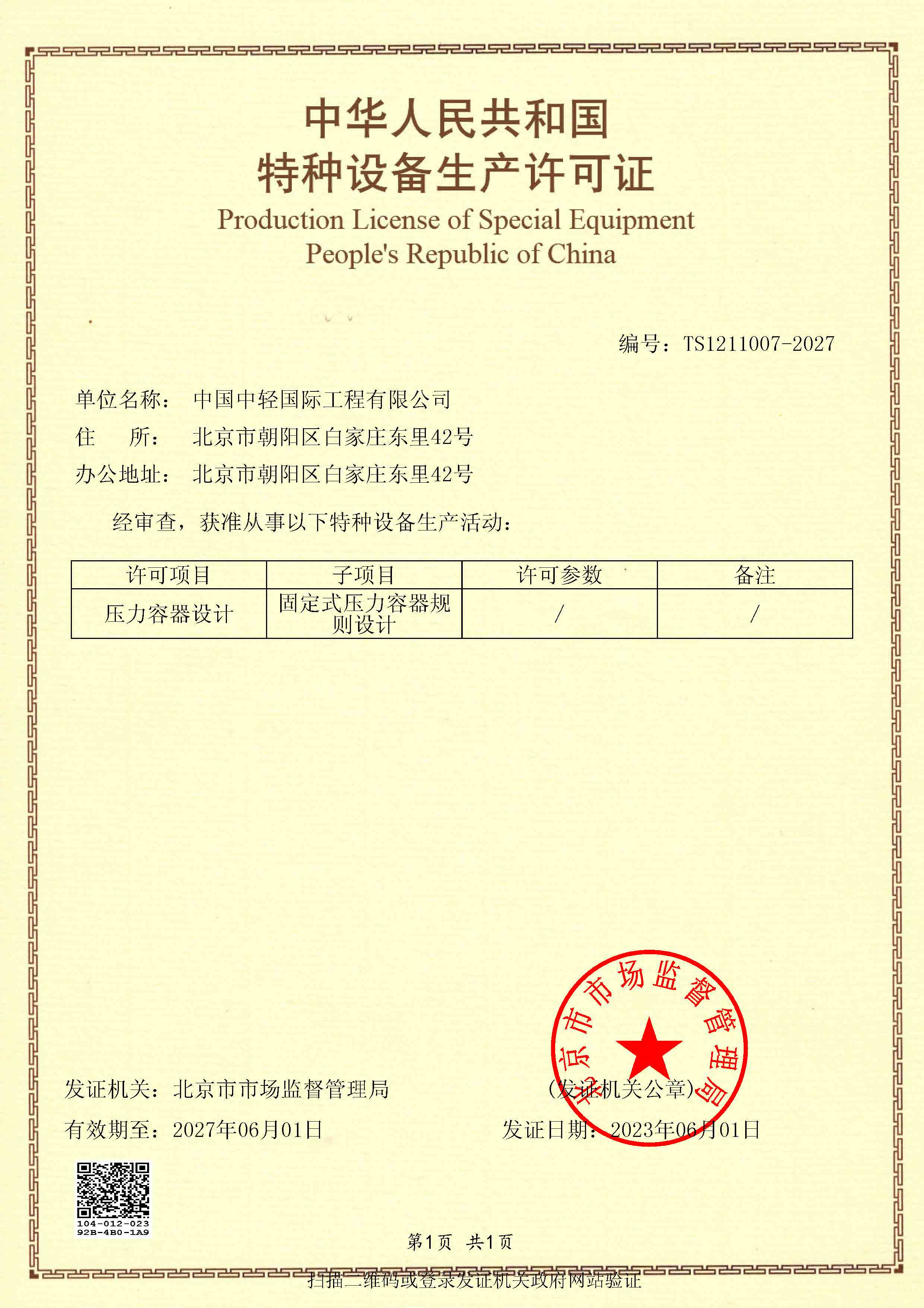 • Special Equipment Design License — Pressure Vessel